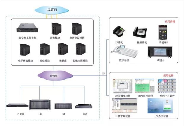 根據(jù)客戶需求結(jié)合以往的工作經(jīng)驗,本方案以實現(xiàn)VPN內(nèi)部通信電話功能為基礎(chǔ),結(jié)合 IP 網(wǎng)絡(luò)發(fā)展為業(yè)務(wù)核心,以一體化、智能化、便捷化管理為設(shè)計理念,綜合 IP 網(wǎng)絡(luò)、軟交換系統(tǒng)、WEB管理等多個應(yīng)用模塊,實現(xiàn)融合通信應(yīng)用。為結(jié)合網(wǎng)絡(luò)化擴(kuò)展本系統(tǒng)采用 SOC1000 軟交換為系統(tǒng)核心交換,與中繼系統(tǒng)IP話機(jī)+申甌IAD配合組網(wǎng)。