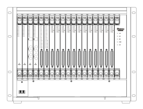機框為19英寸標準機箱,可選擇壁裝和標準機架安裝。環(huán)路中繼和用戶可實現(xiàn)在規(guī)定容量內(nèi)任意配置。各單元板排序為MCU->CCS->FXO->FXS->PWR,見下圖。