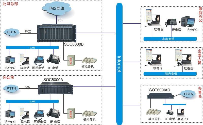 ? 分布式部署:總部、各分公司、辦事處的分機,是通過IP網(wǎng)絡(luò)融合在一個語音平臺上來實現(xiàn)內(nèi)部通信??偛亢娃k事處分機、出差人員的軟電話均注冊在總部的SOC8000IPPBX上,各分公司的分機注冊在本地的IP PBX或IAD上,由本地獨自管理。