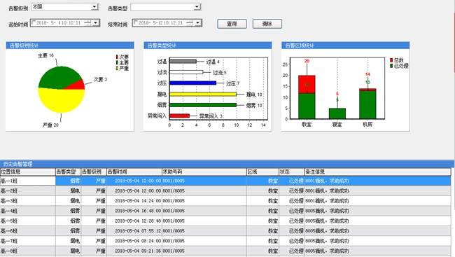 當(dāng)下各類傳感器已經(jīng)進(jìn)入我們的生活,很多環(huán)境的檢測(cè)告警都已通過傳感器實(shí)現(xiàn),申甌校園智控“云”系統(tǒng)融合了各類傳感器,如煙感、紅外、過壓、過流、過溫、漏電等等。可部署在學(xué)校的教學(xué)樓、宿舍樓、機(jī)房等。一旦觸發(fā)告警,我們的告警平臺(tái)(下圖所示)會(huì)“自動(dòng)彈窗告警”,告警彈出窗口會(huì)顯示哪個(gè)時(shí)間、什么地點(diǎn)、發(fā)生了什么類型的告警,通過系統(tǒng)的多維度圖表分析,我們可分析告警的占比情況,如告警嚴(yán)重性等級(jí)、告警類型分類、告警地點(diǎn)。并且報(bào)警會(huì)觸發(fā)我們預(yù)先設(shè)置好的報(bào)警終端話機(jī),接聽后會(huì)自動(dòng)重復(fù)播報(bào)發(fā)生報(bào)警的地址位置。通過此系統(tǒng),我們能將預(yù)防做到前面、將危險(xiǎn)控制在萌芽階段。