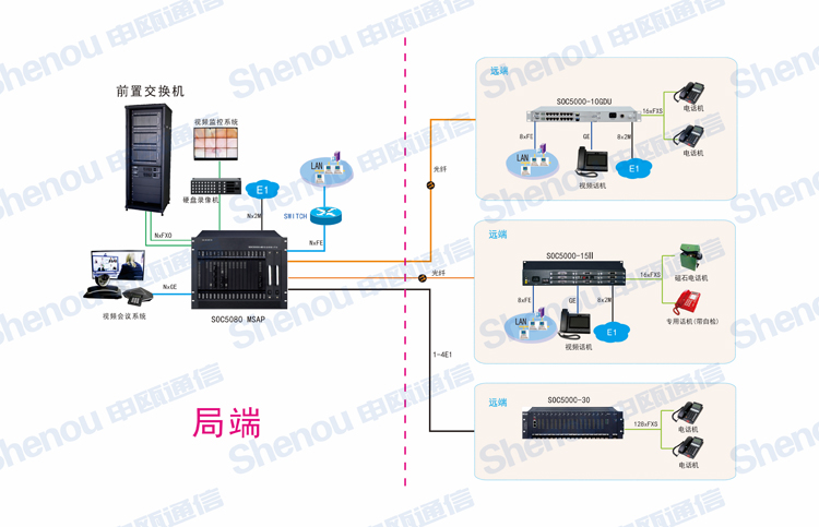 SOC-H03型話路復(fù)用器是利用E1(G.703)接口傳輸30路二線環(huán)路音頻或2/4線載波音頻的通信設(shè)備,并且有語音保密功能,特別適用于有光纜鋪設(shè)而無電纜鋪設(shè),或語音需要保密(如部隊(duì))的場合,利用SOC-H30話路復(fù)用器可以使一個(gè)集團(tuán)公司或一個(gè)系統(tǒng)單位共用一臺程控用戶交換機(jī),不僅便于管理和維護(hù),而且還可以降低成本,電信運(yùn)營商可以作為遠(yuǎn)端模塊使用。增強(qiáng)型SOC-H30話路復(fù)用器也可利用n*64K的傳輸方式一部分傳語音,一部分傳以太網(wǎng)數(shù)據(jù)或其它業(yè)務(wù),并且直接同具有中國一號信令、中國七號信令或PRI信令的E1接口相連接,實(shí)現(xiàn)2M的遠(yuǎn)端接入。