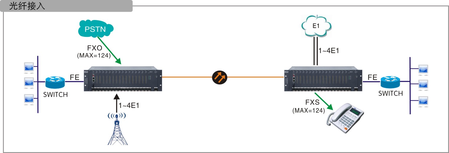 采用光纖線路傳輸,設備可配置124路FXO或FXS、4E1、1~2路物理隔離以太網(wǎng)業(yè)務。